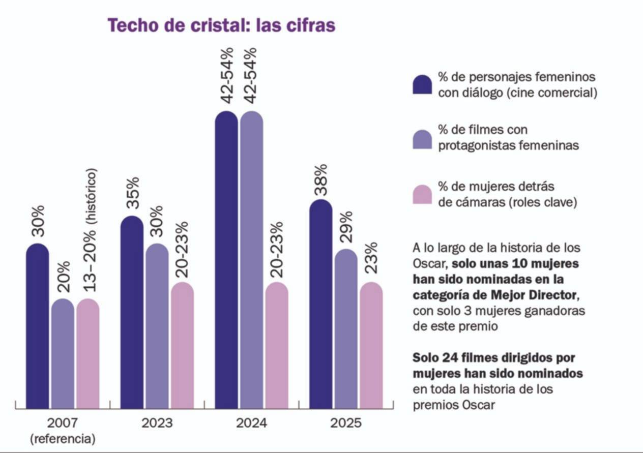 Eso, en la pantalla: detrás de cámara, en 2025 las mujeres constituyeron aproximadamente el 23% de los roles en los 250 filmes más taquilleros, con 13% en dirección y menores porcentajes en escritura y cinematografía.