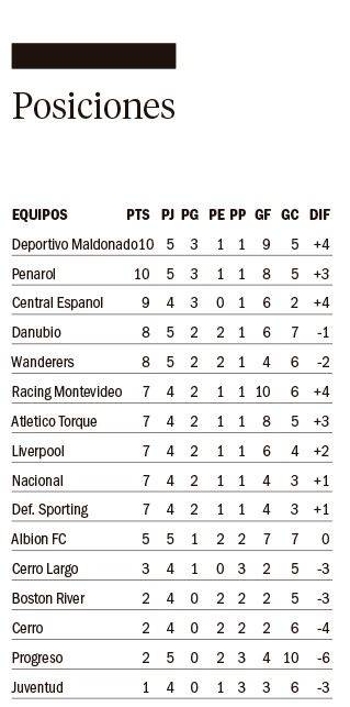 Peñarol se aprovechó del empate de Deportivo Maldonado para alcanzar la punta del torneo Apertura, que hoy se completará con los siguientes partidos: Boston River-Liverpool y Cerro Largo-Motevidero Torque. Tanto Liverpool como Torque pueden llegar a lo más alto de la tabla en caso de ganar sus partidos.