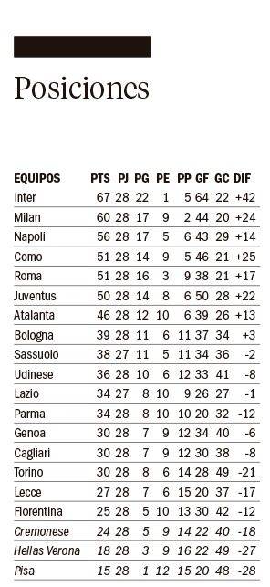 Gracias a este resultado, el Calcio gana algo de emoción, ya que el Milan, segundo, recorta de 10 a 7 puntos su desventaja respecto al líder Inter.