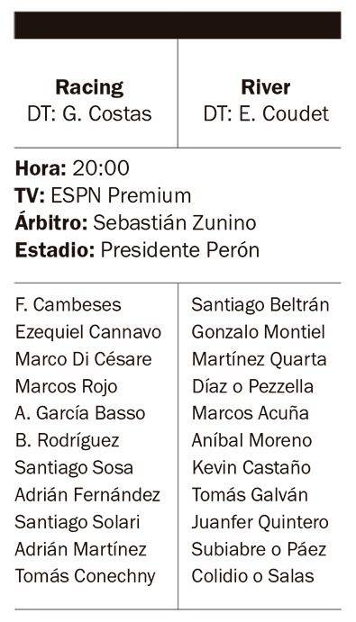River, dirigido por Eduardo Coudet, afronta esta noche desde las 20 una prueba de fuego tras su empate en Bolivia, cuando enfrente a Racing, en el Cilindro de Avellaneda, con varios futbolistas que no suelen ser titulares.