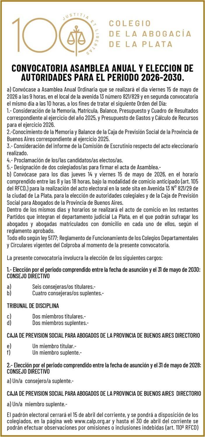 Colegio de la Abogacía de La Plata: convocatoria asamblea anual y elecciones de autoridades