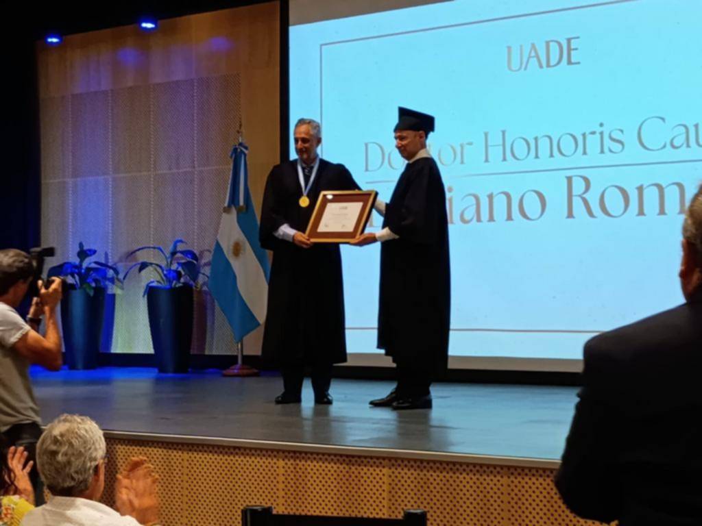 La distinción de Doctor en Honoris Causa recibió ayer el periodista platense Luciano Román de parte de la Universidad Argentina de la Empresa (UADE), en una emotiva ceremonia anoche en la sede porteña de esa casa de estudios, con la participación de varias personalidades de nuestra ciudad, en un salón repleto.