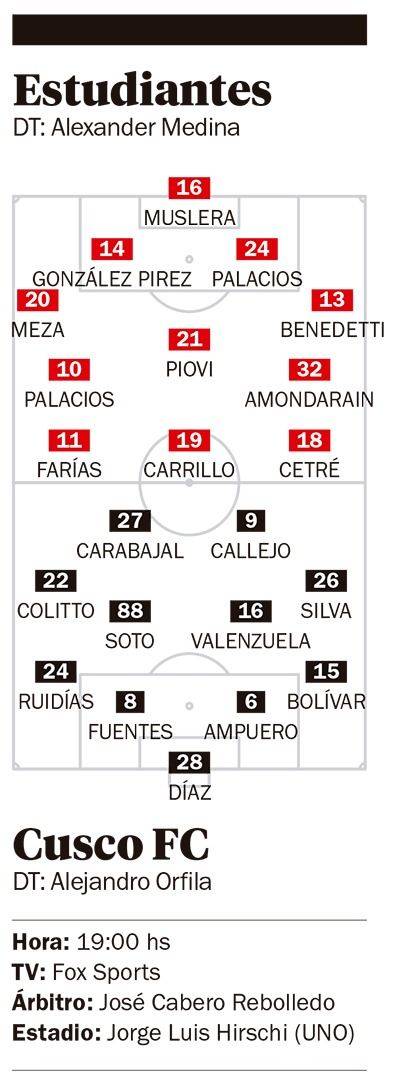 En definitiva, los once del Pincha para el choque copero ante Cusco FC, serían: Fernando Muslera; Eric Meza, Leandro González Pirez, Tomás Palacios, Gastón Benedetti; Mikel Amondarain, Ezequiel Piovi, Alexis Castro o Facundo Farías; Tiago Palacios, Guido Carrillo y Edwuin Cetré o Brian Aguirre.