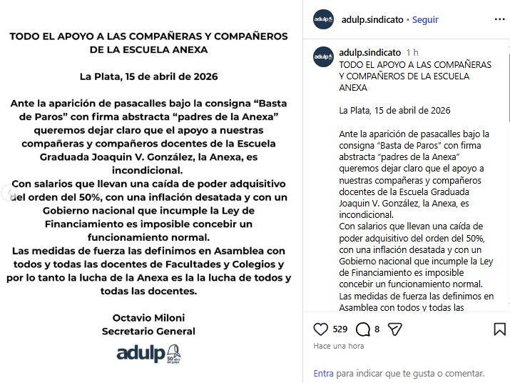 "Queremos dejar en claro que el apoyo a nuestras compañeras y compañeros docentes de la Escuela Joaquín V. González, la Anexa, es incondicional", fue el contundente mensaje de ADULP.