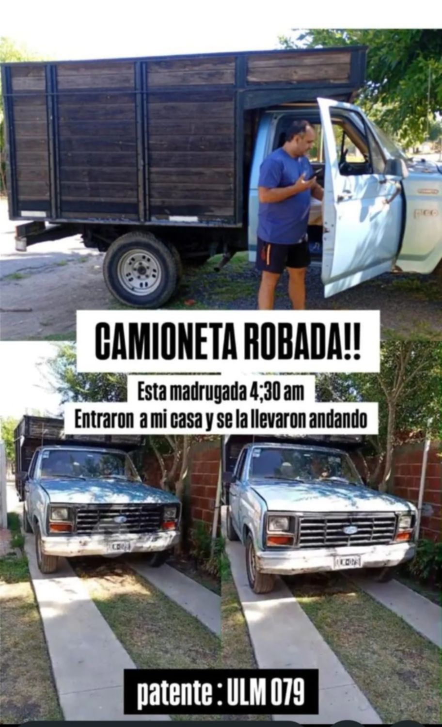 Una familia de San Carlos está desesperada por encontrar la camioneta Ford F-100 que le robaron cuatro ladrones en las últimas horas y es su principal herramienta de trabajo. Ocurrió este miércoles cerca de las cuatro y media de la madrugada en 521 entre 142 y 143.