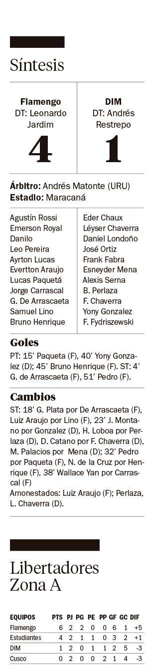 El partido fue un trámite porque el Flamengo manejó la pelota y fue amplamente superior a un rival que volvió a mostrar que no tiene marca ni le gusta ese aspecto del juego. Pronto estaba 1-0 arriba pero erró tantos goles que el DIM lo empató. En el último minuto Bruno Henrique hizo el segundo y luego fue un trámite. De Arrascaeta hizo el tercero en el complemento. y Pedro el cuarto en el final.