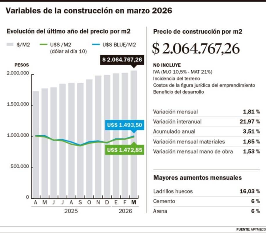El costo de la construcción en la región registró un aumento del 1,81% en marzo y el valor del metro cuadrado en dólares se acerca a su máximo histórico, situándose en 1.493,50, según el informe mensual de la Asociación Pymes de la Construcción de la Provincia de Buenos Aires (Apymeco).