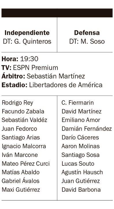 Independiente, con un objetivo bien claro, recibe hoy a Defensa y Justicia, por la decimoquinta fecha de la Zona A del Torneo Apertura, en busca de un triunfo que le permita afianzarse en los puestos de clasificación a los playoffs.