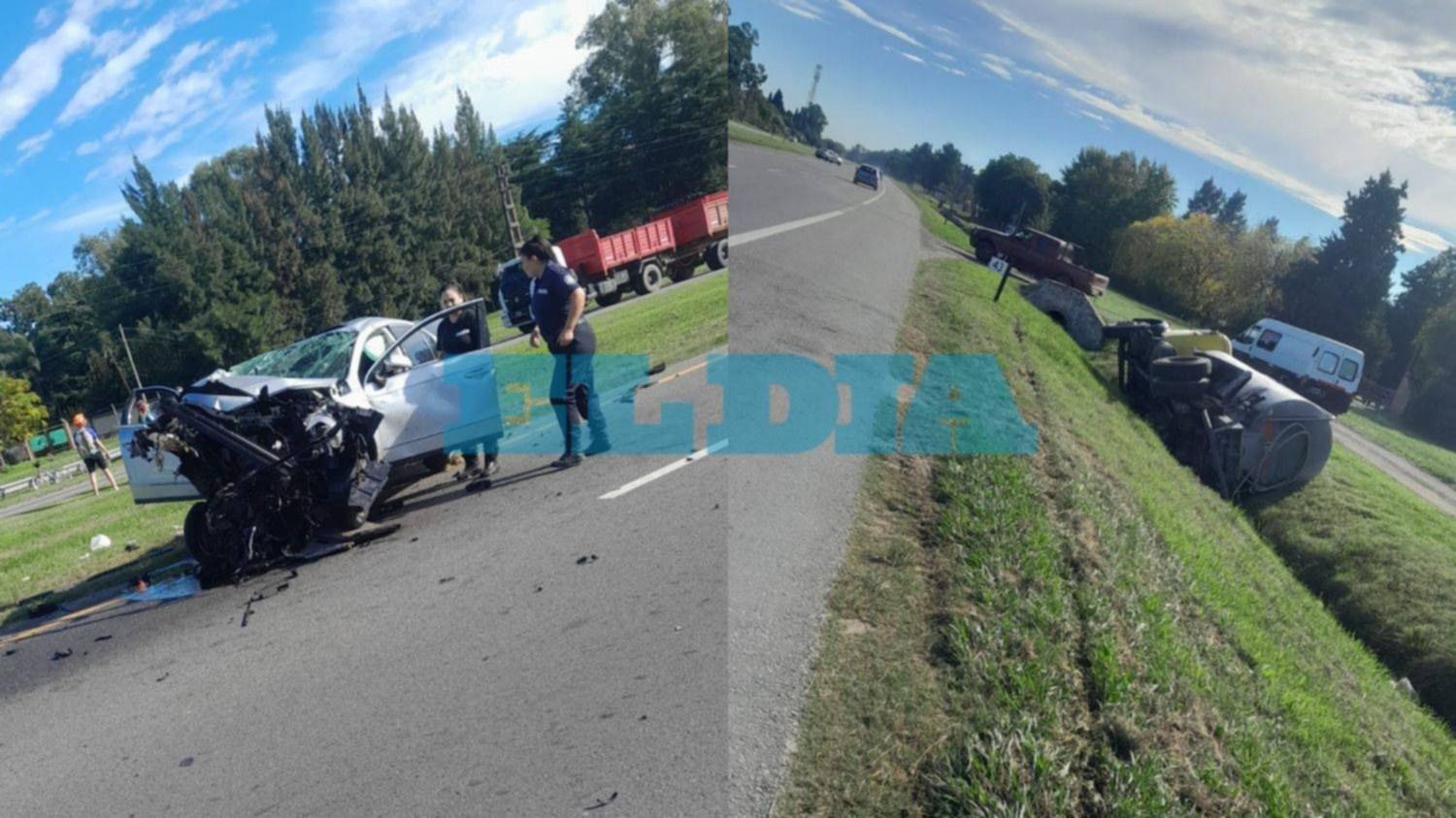 El hecho más reciente se registró en la Ruta 2, a la altura del kilómetro 43, donde un automóvil impactó contra un camión que transportaba leche. Como consecuencia del choque, el vehículo de menor porte quedó completamente destruido en su parte frontal, mientras que el camión terminó volcando sobre la calzada.