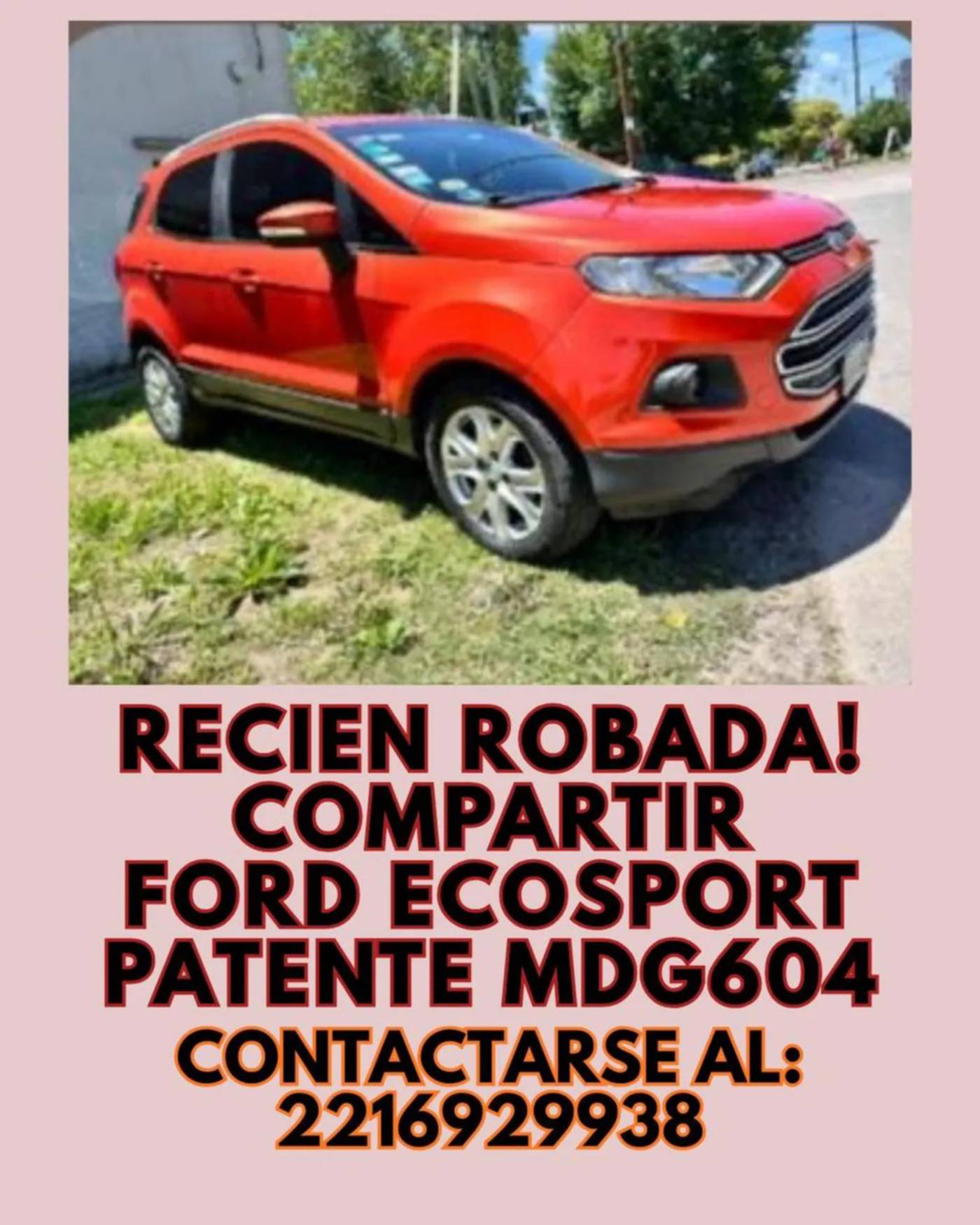 Además de llevarse el medio de transporte, los asaltantes se apoderaron del teléfono celular del damnificado, dejándolo incomunicado en el lugar. El rodado robado es una camioneta Ford EcoSport de color naranja.