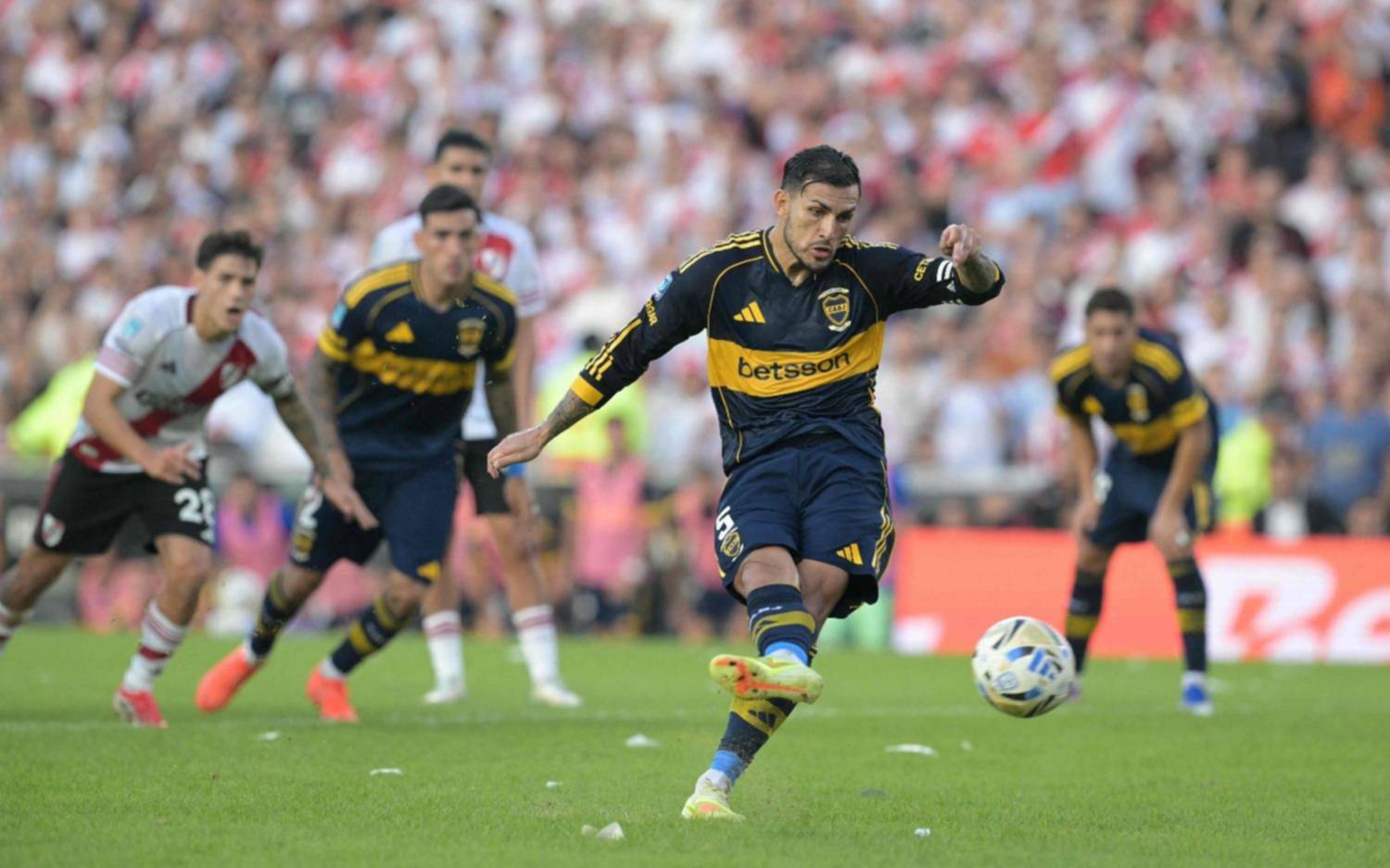 En el segundo y último minuto de descuento de la primera etapa, una mano extendida del defensor Lautaro Rivero dentro del área generó un penal para la visita, del que se hizo cargo el mediocampista Leandro Paredes. El exjugador de la Roma sacó un gran remate que entró por el ángulo izquierdo de Beltrán, para el 1-0. El mediocampista de Boca, Leandro Paredes, abrió el marcador en el Superclásico con una gran ejecución de penal en la que metió el festejo del Topo Gigio, al mejor estilo de Juan Román Riquelme.