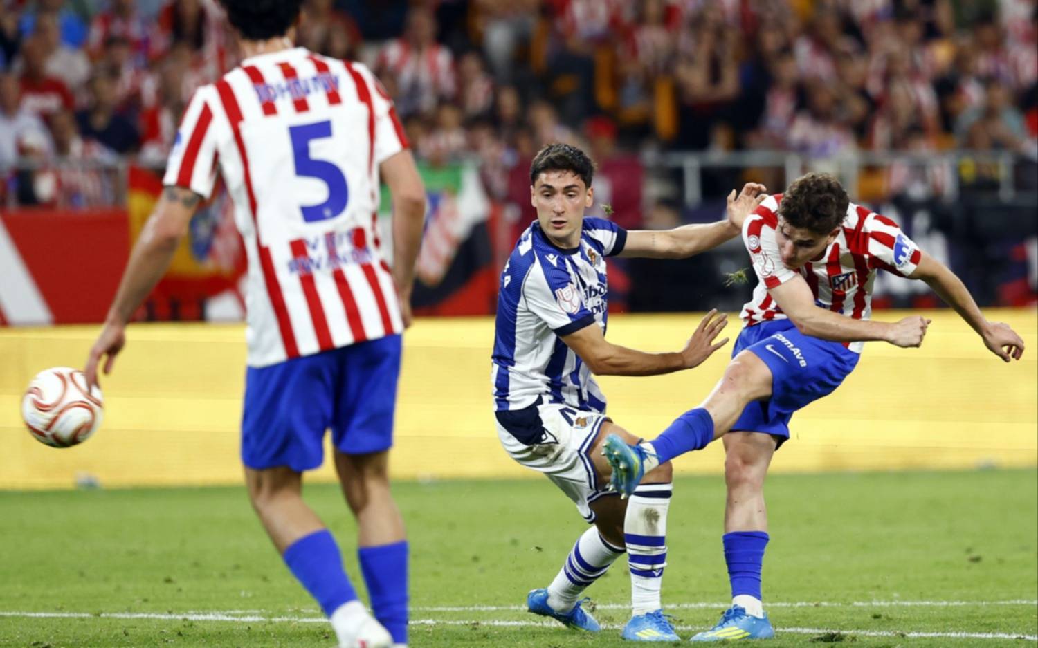 Antes del minuto de juego, el equipo vasco se puso en ventaja con un gol de Ander Barrenetxea, mientras que el nigeriano Ademole Lookman le dio la igualdad transitoria al Atlético Madrid. Sobre el final de la parte inicial, Mikel Oyarzábal, de penal, le dio la ventaja a Real Sociedad, y ya cerca del final del encuentro Julián Alvarez anotó para el conjunto madrileño y forzó los penales.