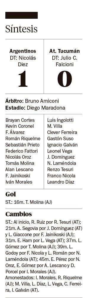 Argentinos Juniors ganó y dio otro paso en su lucha por ingresar a los Playoffs. Anoche, se impuso por 1-0 a Atlético Tucumán, en un partido intenso jugado en La Paternal. El único gol lo marcó Tomás Molina, a los 16 minutos del complemento. Así, el Bicho alcanzó el segundo puesto e igualó la línea de River en el Grupo B.