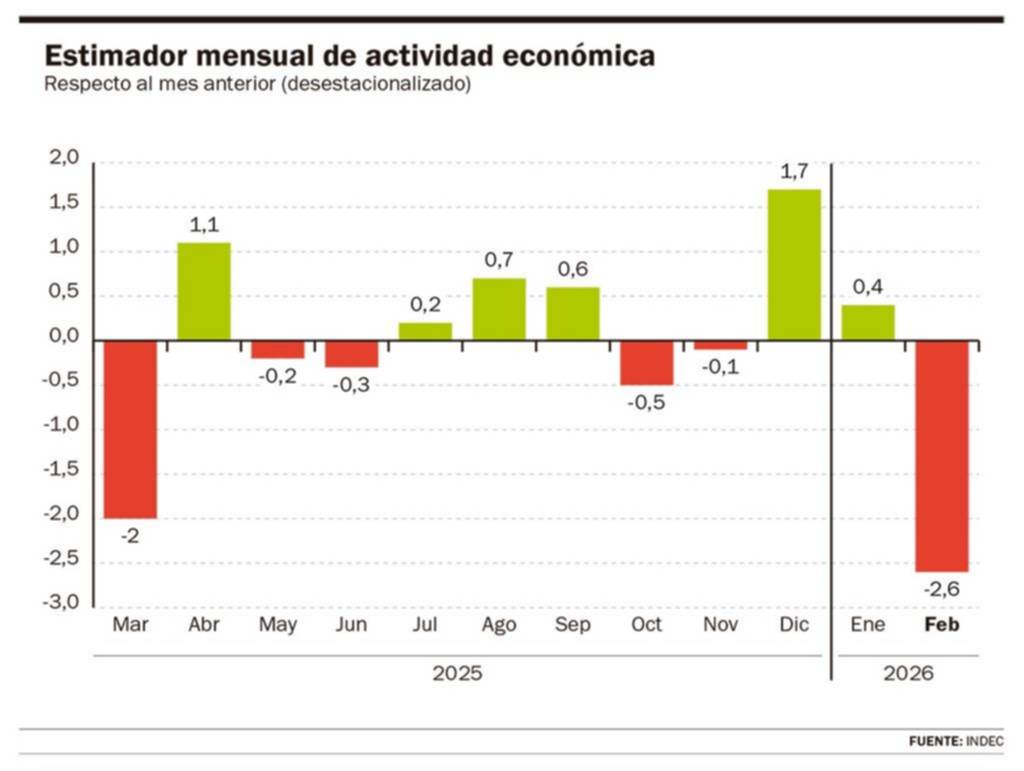 La economía argentina registró en febrero de 2026 su peor resultado mensual desde diciembre de 2023. El Estimador Mensual de Actividad Económica (EMAE) que publica el Instituto Nacional de Estadística y Censos (INDEC) mostró una contracción de 2,6% frente a enero, la misma magnitud que la caída de aquel diciembre. En la comparación interanual, el retroceso fue de 2,1% respecto de febrero de 2025, una performance que solo supera el -2,4% de septiembre de 2024.