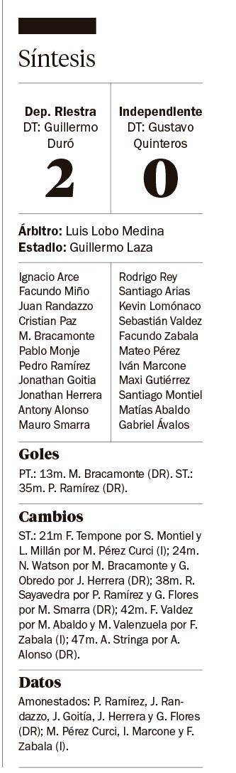 La espera terminó y Deportivo Riestra sumó su primer triunfo en el Torneo Apertura. Derrotó por 2-0 a Independiente en el Estadio Guillermo Laza, y puso en jaque la clasificación del Diablo a la siguiente instancia del campeonato. Bracamonte y Ramírez convirtieron los goles del encuentro.