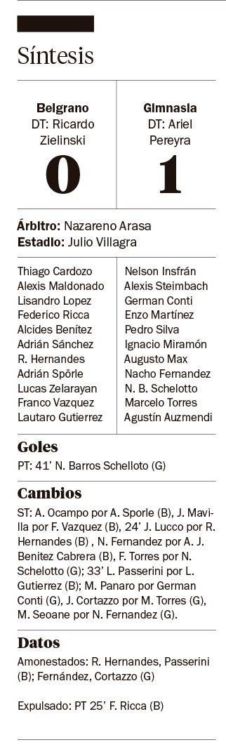 En el inicio del segundo tiempo, Zielinski metió un par de variantes y Belgrano mostró otra actitud para adelantarse en la cancha. Campo y pelota dejaron de ser exclusividad de Gimnasia, que tuvo solo un buen remate de Miramón a las manos del arquero. Hernandes, con un remate que encontró un desvío, casi alcanza el empate.