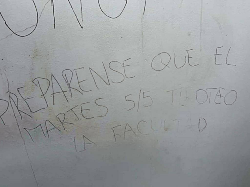 El escrito, en una pared, advierte sobre un presunto ataque armado programado para el próximo martes 5 de mayo, con la frase: “Prepárense que el martes 5/5 tiroteo en la Facultad”.