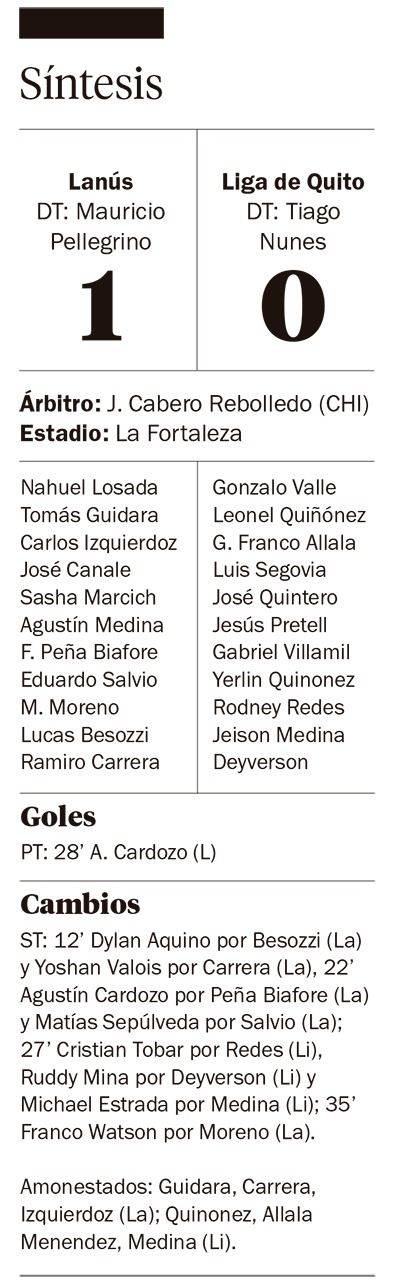 Lanús derrotó a Liga de Quito de Ecuador por 1 a 0 en un encuentro en el que fue ampliamente superior y que disputaron anoche en el estadio Néstor Díaz Pérez, por la tercera fecha del grupo G de la Copa Libertadores 2026.