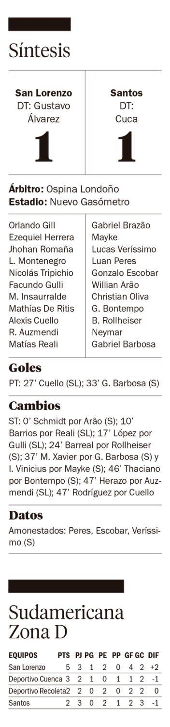 Por la fecha 3 del grupo D, el conjunto azulgrana empató 1-1 ante el Santos, donde fue titular Neymar y el ex Estudiantes, Benjamín Rollheiser, dos participes necesarios para que la escuadra brasileña se pueda llevar un punto (el primero como visitante) en su visita a nuestro país.