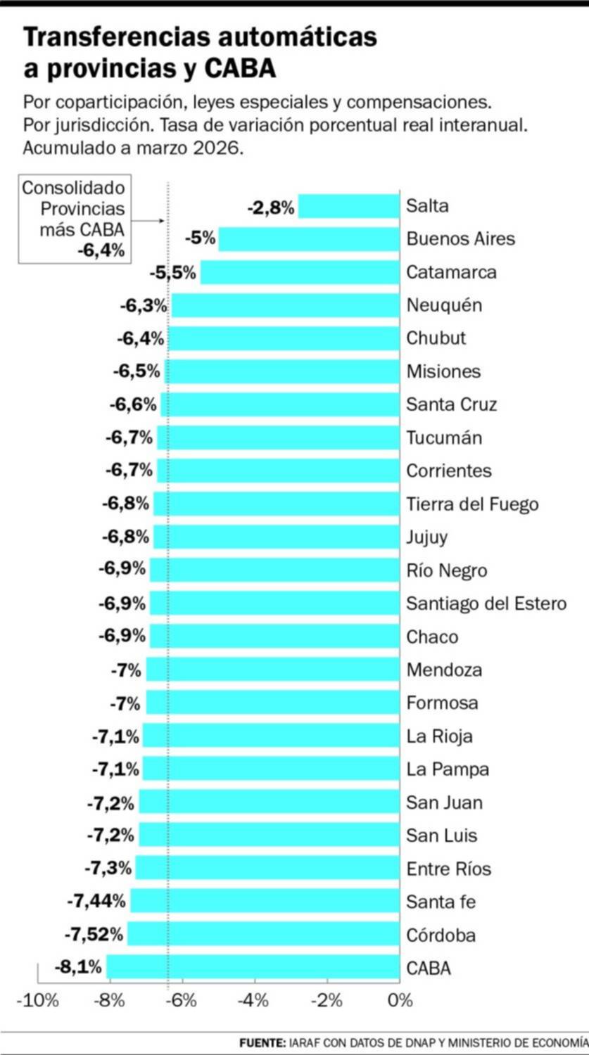 Existe una marcada disparidad en el impacto de la caída de recursos en las distintas jurisdicciones durante el mes de marzo. Salta, que recibió $195.244 millones, se destacó como la única provincia que logró una variación positiva en sus ingresos reales, con un leve incremento del 0,4 por ciento. En el extremo opuesto, la Ciudad Autónoma de Buenos Aires (CABA) fue la más perjudicada, con un descenso real de sus recursos del 7,2% (recibió $108.760 millones).