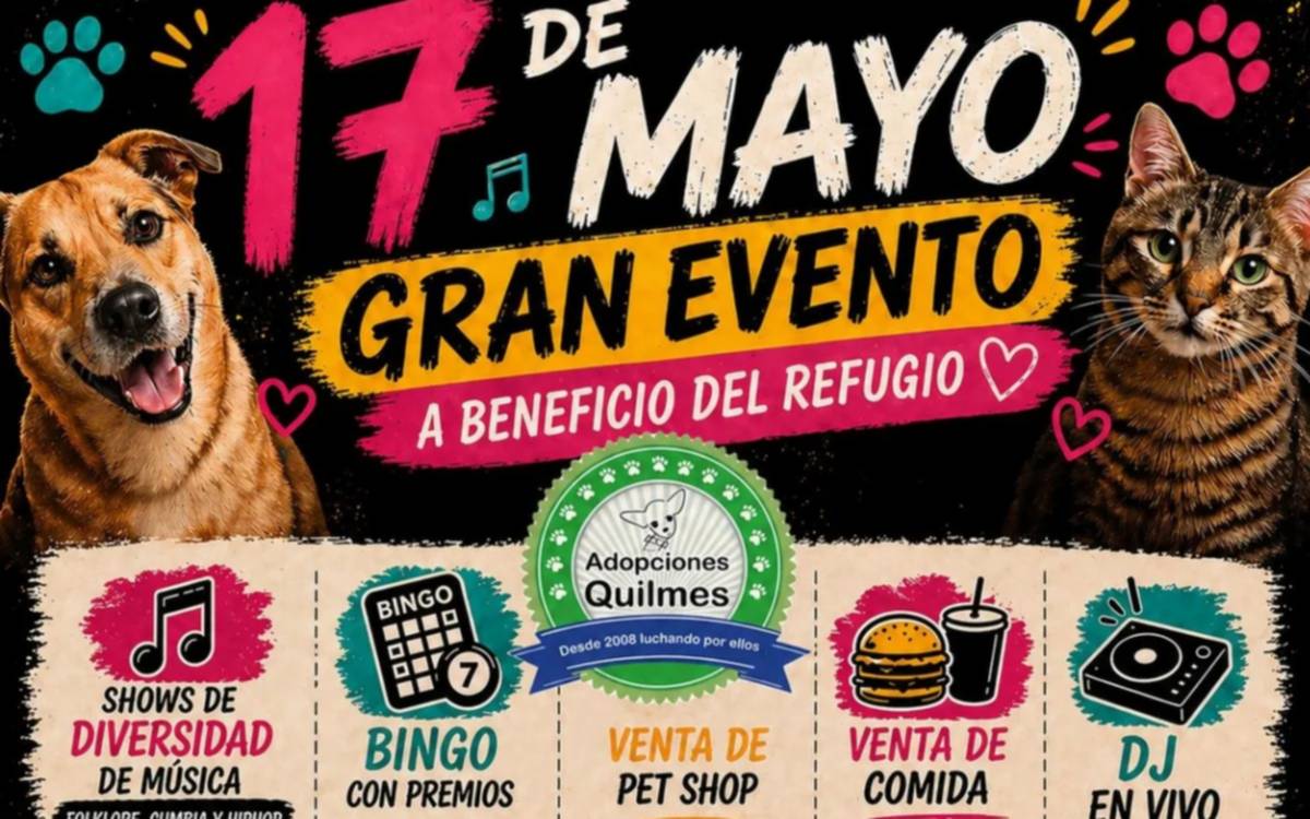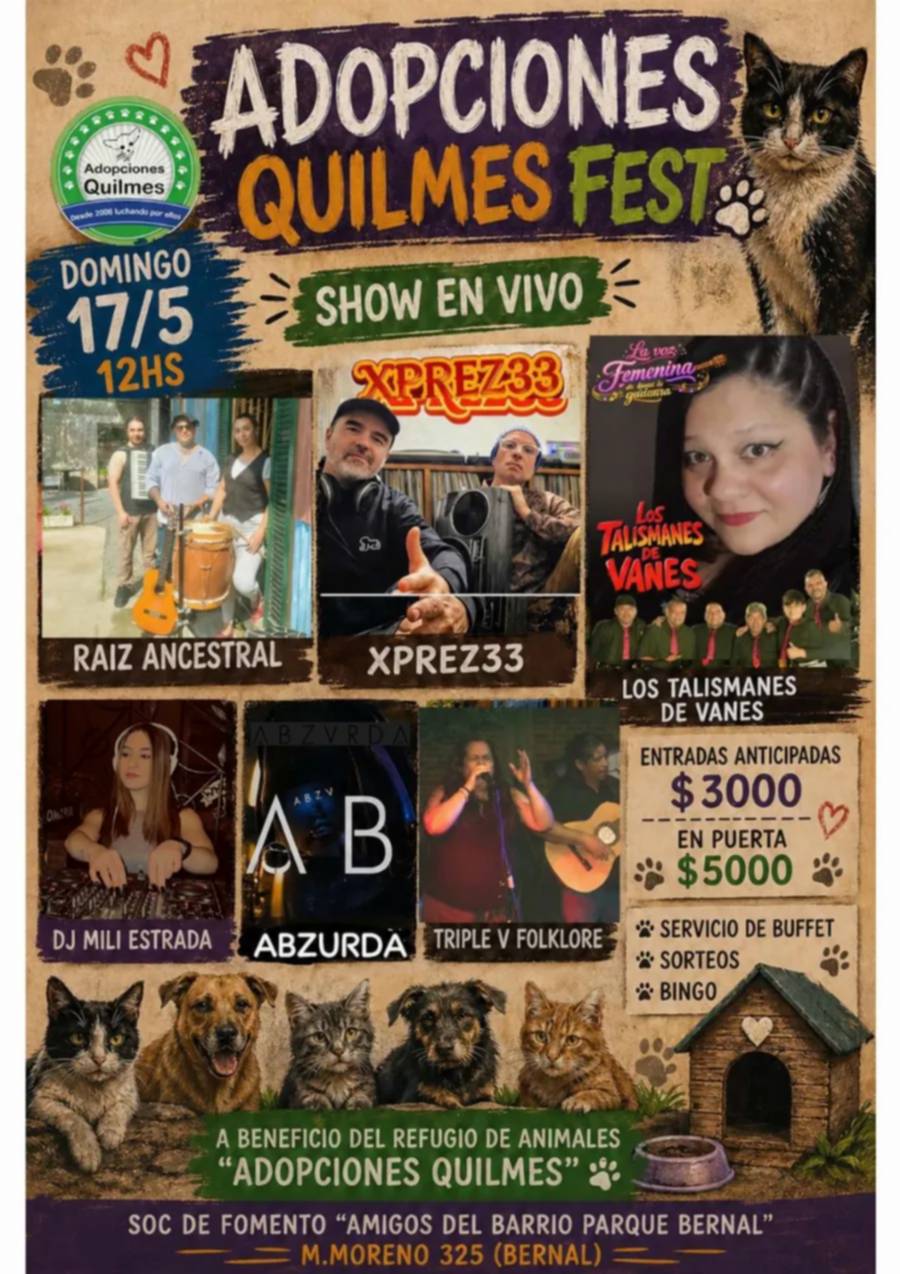 El refugio Adopciones Quilmes realizará el festival solidario "Adopciones Quilmes Fest" mediante una jornada de espectáculos y sorteos el domingo 17 de mayo al mediodía en la Sociedad de Fomento de Barrio Parque Bernal. La organización busca fondos urgentes para saldar deudas veterinarias y comprar alimento para los animales rescatados en el distrito. Los voluntarios dispusieron la sede de Mariano Moreno 325 para recibir a los vecinos en este encuentro familiar.
