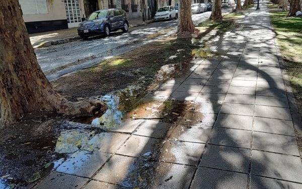 La rambla de 53 entre 15 y 16 parece un lago. Desde hace varias semanas una cañería rota inundó gran parte del tramo verde y la vereda, lo que dificulta el paso peatonal.