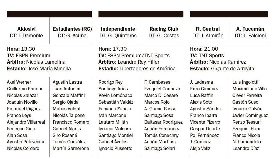 Además del derby, hoy jugarán Aldosivi- Estudiantes de Río Cuarto y Rosario Central-Atlético Tucumán. En Mar del Plata, el Minella será escenario de un duelo para escapar del descenso, que comenzará a las 13.30 y contará con el arbitraje de Nicolás Lamolina. Por la noche, desde las 21.00, Rosario Central recibirá en el Gigante al recuperado Atlético Tucumán que dirige Julio César Falcioni. El encuentro será dirigido por Nicolás Ramírez y televisado por TNT Sports.