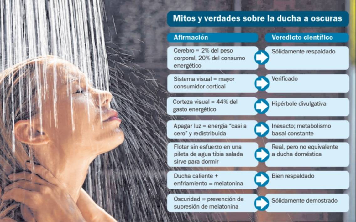 Muchos textos de divulgación afirman que apagar la luz de la ducha reduce el consumo energético de la corteza visual “casi a cero” y que esta energía se redistribuye a otros procesos. Esta idea es inexacta. El cerebro mantiene un metabolismo basal constante, incluso durante la oscuridad o el sueño, y la corteza visual sigue activa procesando imaginaciones internas y manteniendo la integridad celular. Si bien la reducción del estímulo visual disminuye parcialmente la actividad regional, nunca llega a un apagado total ni libera energía cortical masiva.