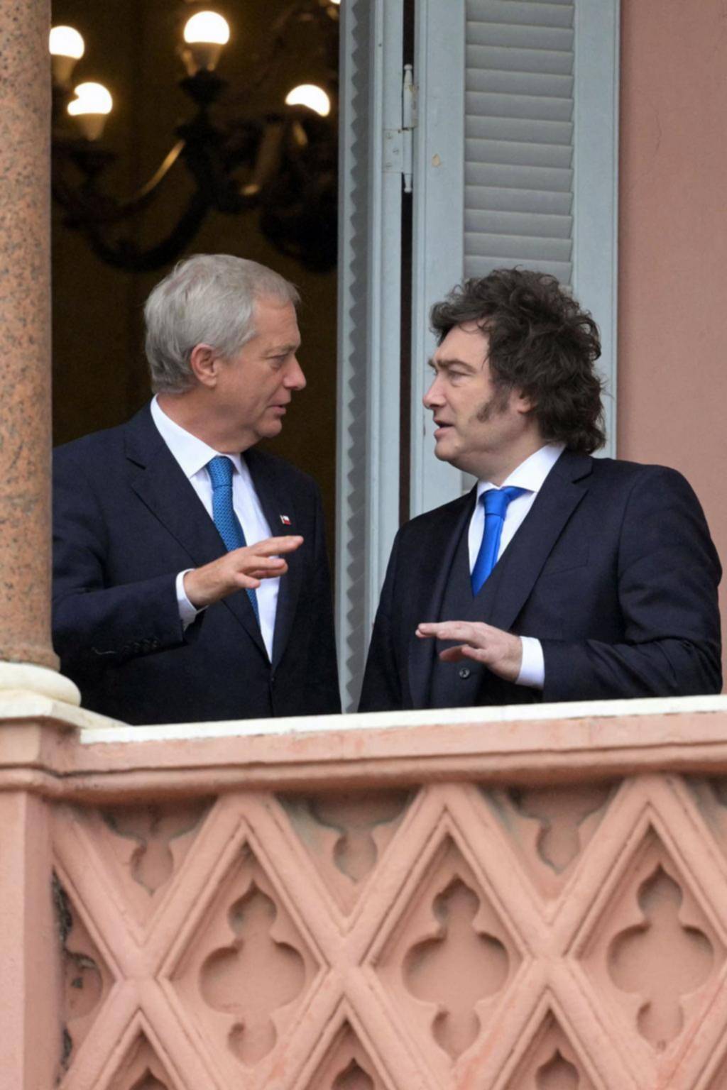 Charla amena en el balcón entre Javier Milei y José Kast /AFP