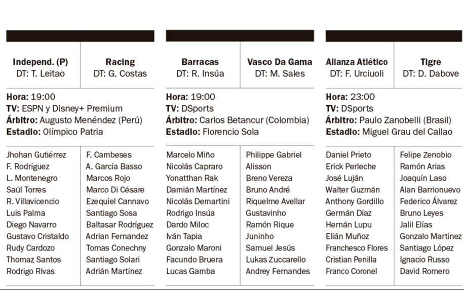 Por último, Tigre visita esta noche desde las 23 (hora de nuestro país) a Alianza Atlético, de Perú en el marco de la apertura del Grupo A. El partido se jugará en el estadio Miguel Grau del Callao, con el arbitraje del brasileño Paulo Zanovelli.
