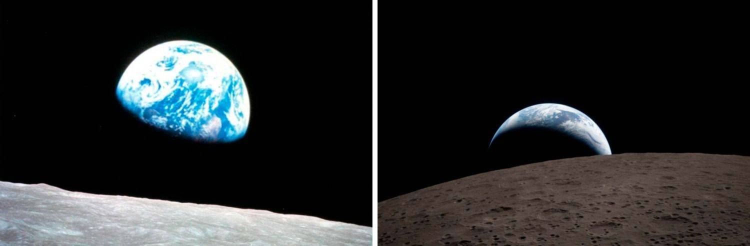 Una imagen de la NASA que muestra la salida de la Tierra sobre la Luna, tomada en la víspera de Navidad, el 24 de diciembre de 1968, desde el Apolo 8 (izquierda). Y una imagen de la NASA que muestra la Tierra ocultándose tras el horizonte lunar, vista desde la nave espacial Orion, el 6 de abril de 2026 (derecha) / AFP