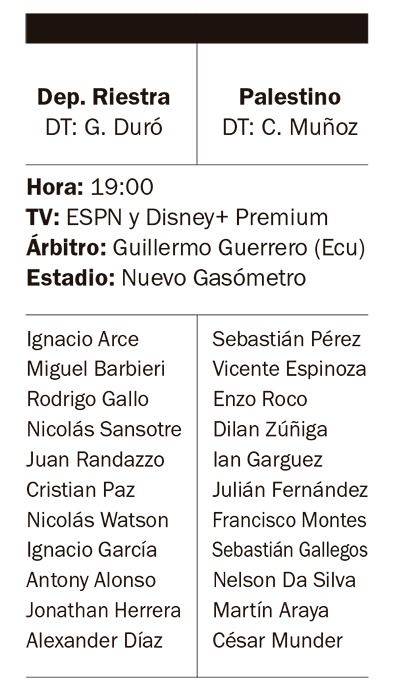 Hoy a las 19 también jugará Deportivo Riestra, que tendrá su debut absoluto en una competición internacional cuando reciba a Palestino de Chile por la primera fecha del Grupo F de la Copa Sudamericana. El cotejo se jugará en la cancha de San Lorenzo, con el arbitraje del ecuatoriano Guillemo Guerrero.