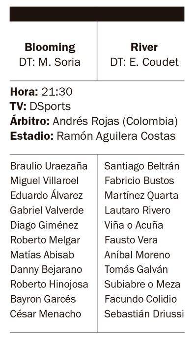 En cuanto al equipo, Coudet emplearía algunas modificaciones para mover futbolistas más allá de la base estable que utilizó en los cotejos anteriores. Maximiliano Salas y Marcos Acuña serán bajas obligadas en el Millonario ya que acarrean sanciones, Gonzalo Montiel y Giuliano Galoppo están mejor de sus lesiones, pero no es seguro que viajen al Altiplano.