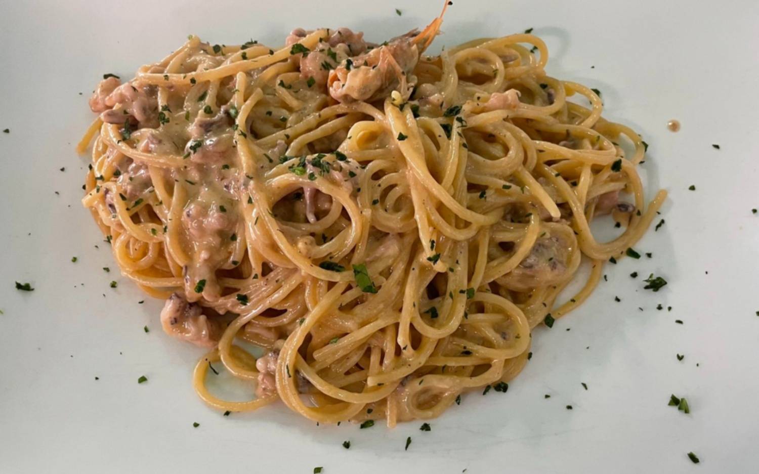 La carbonara es uno de los grandes emblemas de la cocina romana. En esta versión, la receta abandona el guanciale o la panceta y se sumerge en el universo del mar. Langostinos, mejillones, almejas y chipirones se combinan con pescado fresco para crear una salsa profunda y aromática que envuelve la pasta con una textura sedosa.